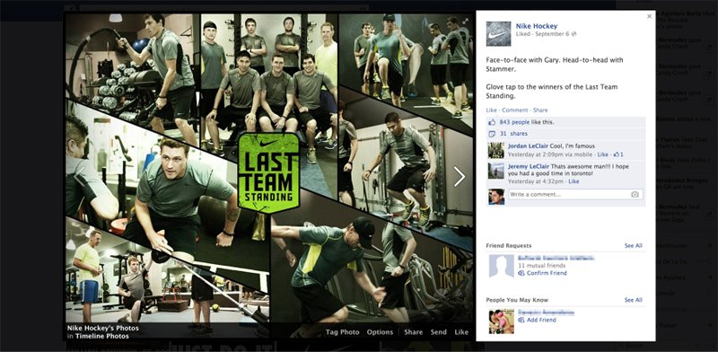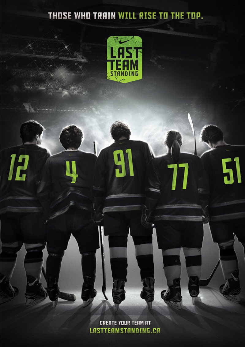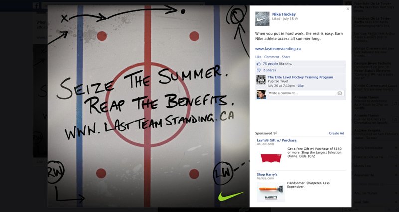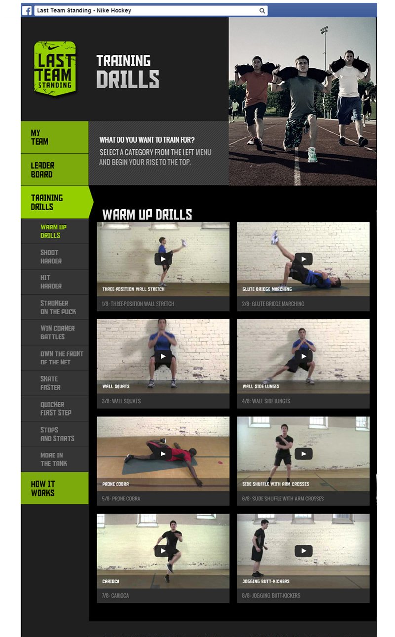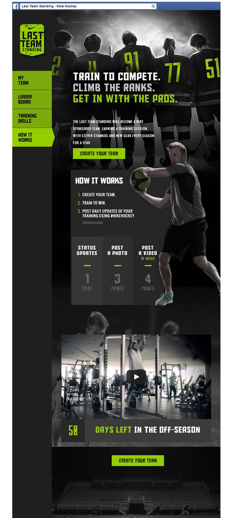 Nike wanted to encourage young hockey players to continue their training during the summer off-season. Last Team Standing is an organized competition where teams compete by showing their training commitment (through status updates and photo/video uploads on Facebook.) The team with the most points at the end of the summer will become a Nike sponsored team and get to train with Steve Stamkos.
